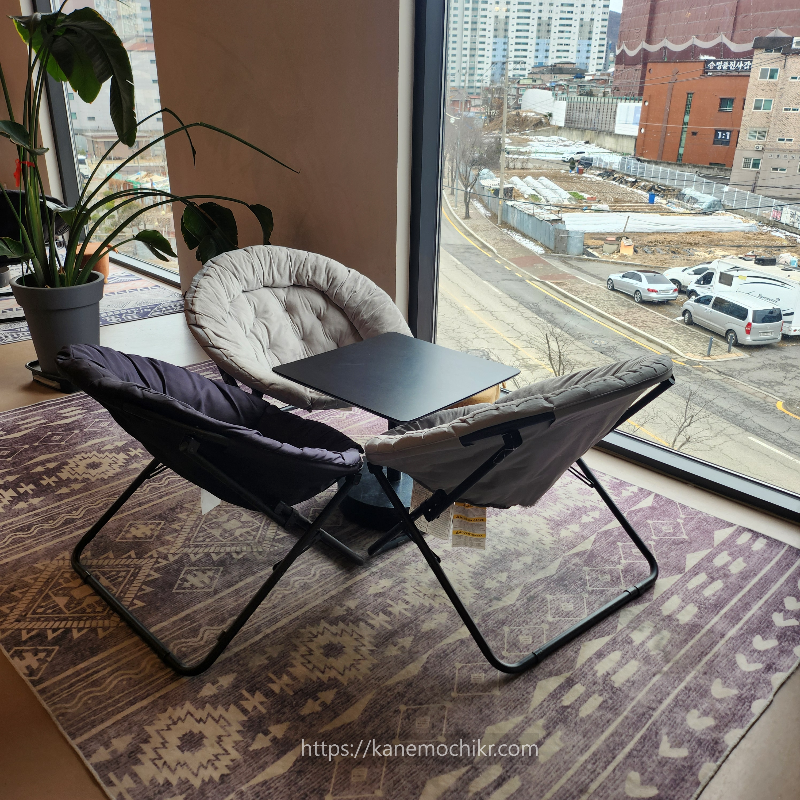 창문 앞의 의자와 테이블이 굉장히 편안해 보였어요