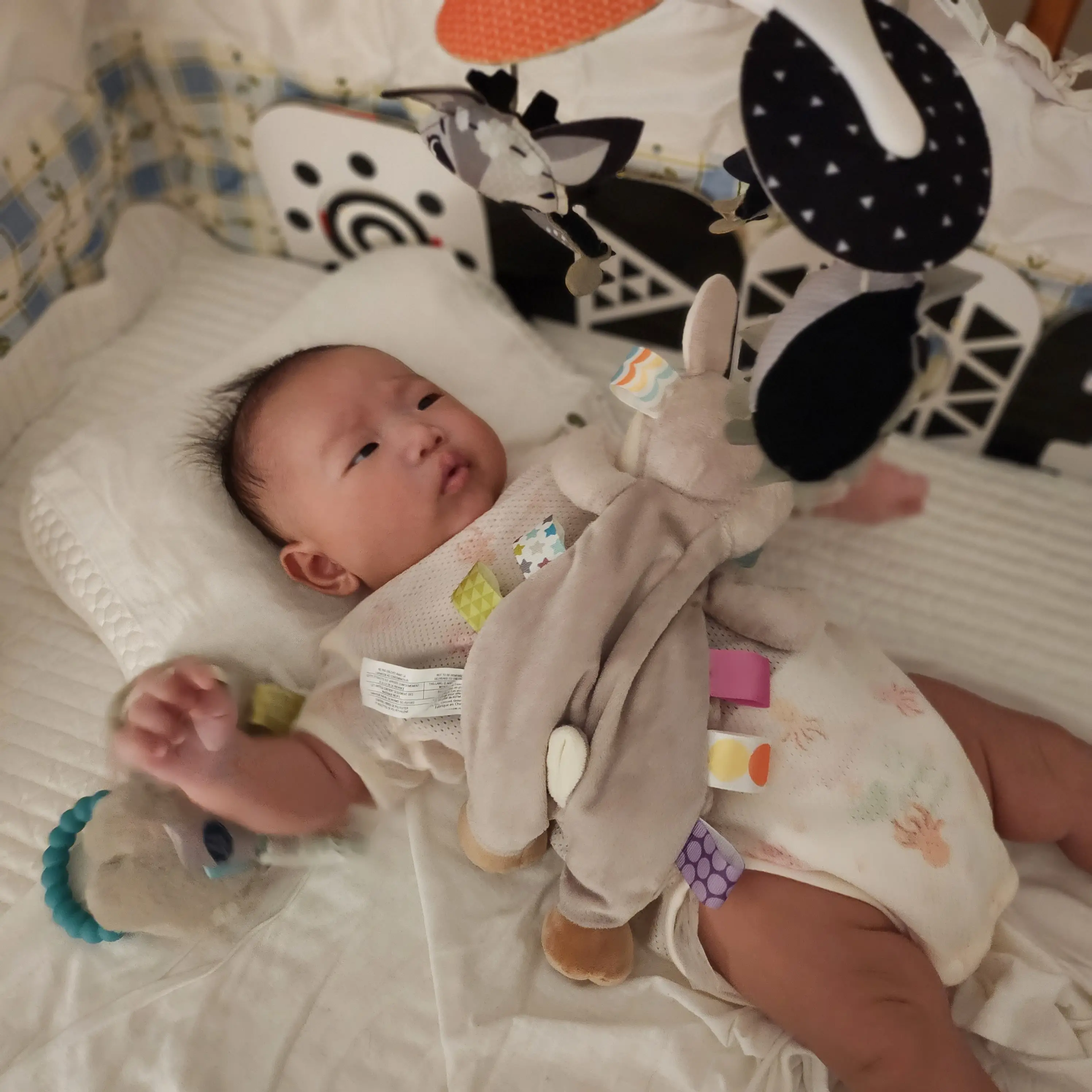 이 시기의 아이의 시력은 약 15cm 앞에 있는 것만 볼 수 있을 정도이기 때문에 너무 멀리 달아놓지 않도록 합니다.