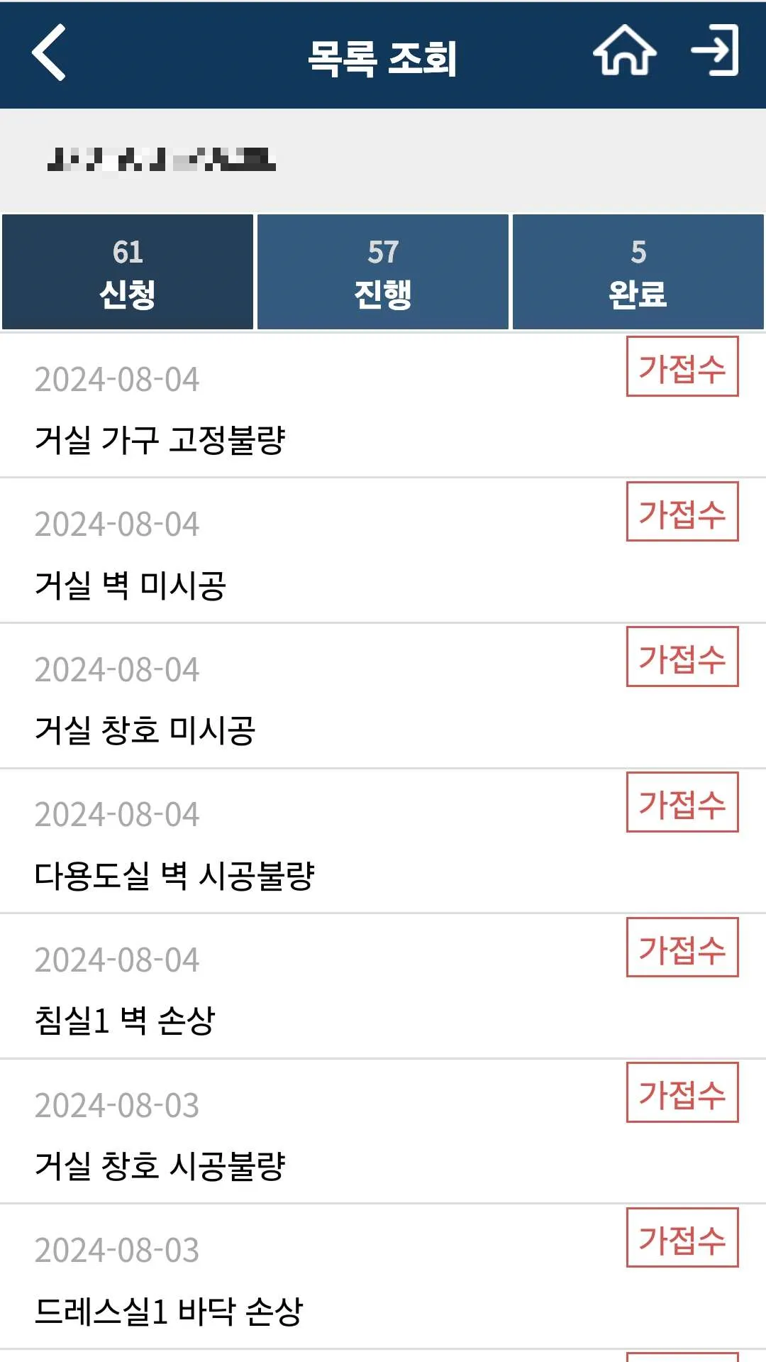 저희는 총 123건의 하자를 접수했습니다 하자접수를 하면 일단 저렇게 가접수 상태가 나오고 시간이 지나면 진행 중인 것과 완료된 것으로 나뉘게 됩니다