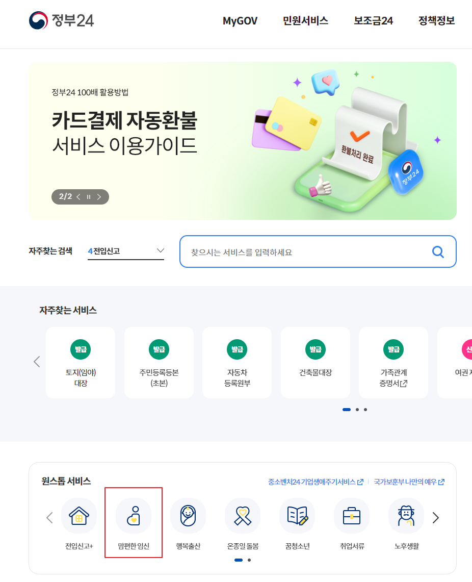 정부 24에 들어가면 원스톱 서비스에 맘편한 임신이 있습니다. 맘편한 임신은 임산부에게 필요한 지원 서비스를 통합하여 신청하실 수 있습니다.