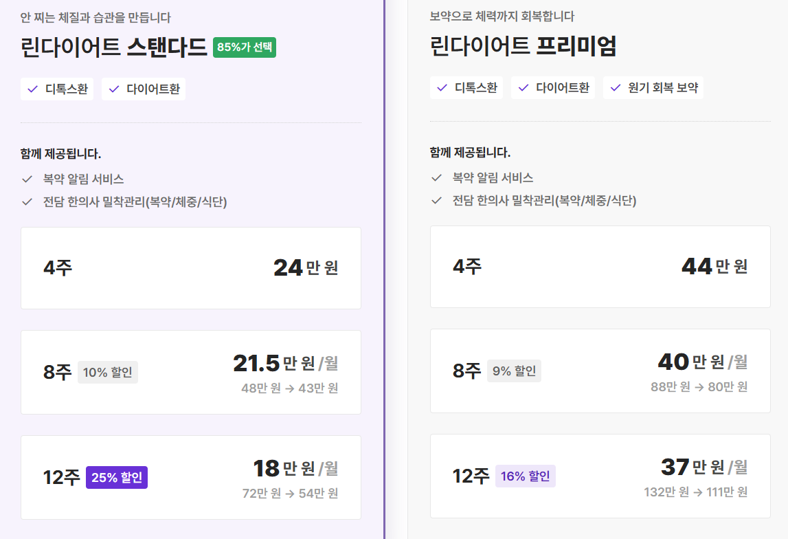 | 린다이어트 스탠다드 8주 43만원 | 린다이어트 프리미엄 8주 80만원 |